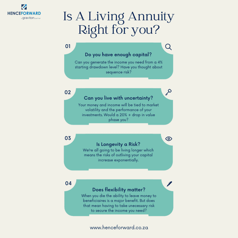 This is why careful financial planning and a well-structured investment strategy are essential when choosing a living annuity. The balance between growth potential, risk management, and sustainable withdrawals is key to ensuring financial security in retirement.
